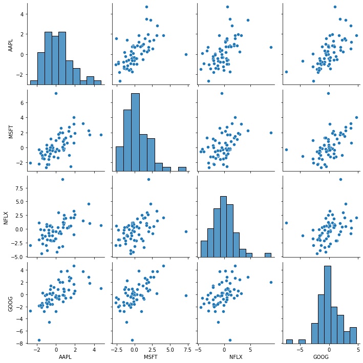 Correlation analysis was conducted to examine the relationships between the daily returns of different stocks. Positive associations were observed, with Netflix and Google showing a modest correlation and Apple and Google exhibiting a strong correlation.